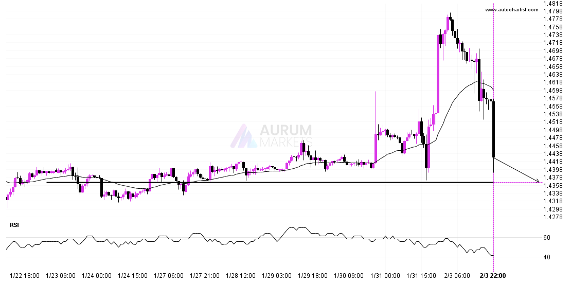 USDCAD is approaching a support line at 1.4366. If it hits the support line, it may break through this level to continue the bearish trend, or it may turn around