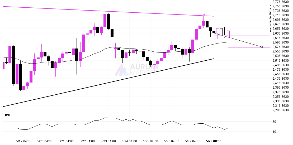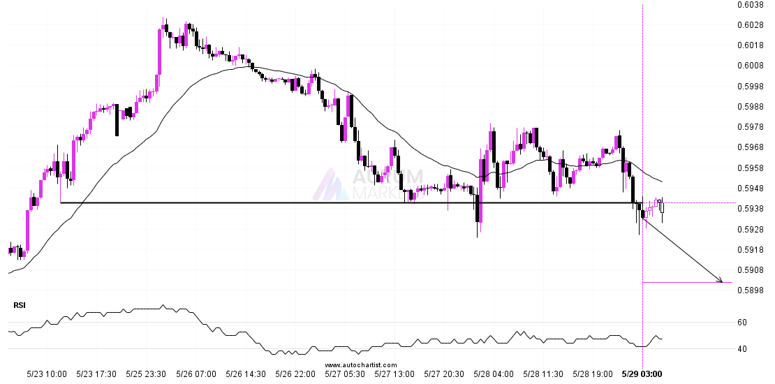 NZDUSD has broken through a support line. It has touched this line numerous times in the last 6 days. This breakout shows a potential move to 0.5902 within the next