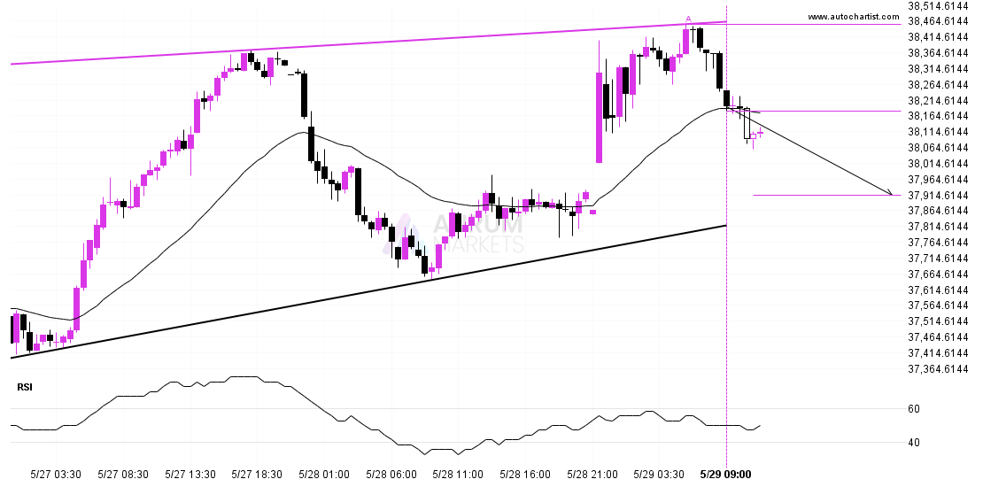 Nikkei 225 was identified at around 38180.0 having recently rebounded of the resistance on the 30 Minutes data interval. Ultimately, the price action of the stock has formed a Rising