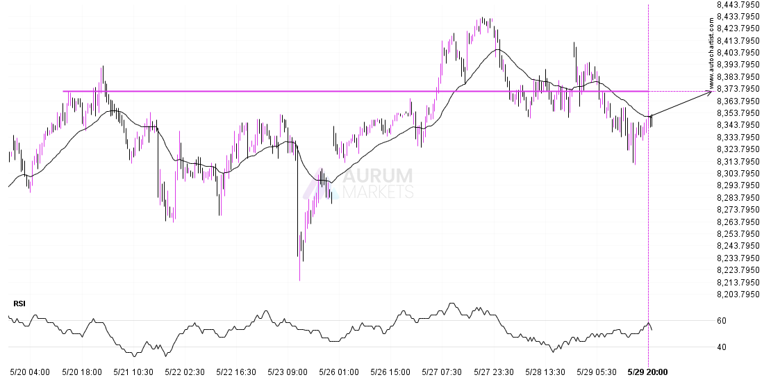 ASX 225 is moving towards a key resistance level at 8371.7002. ASX 225 has previously tested this level 4 times and on each occasion it has bounced back off this