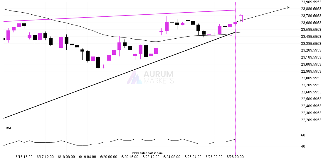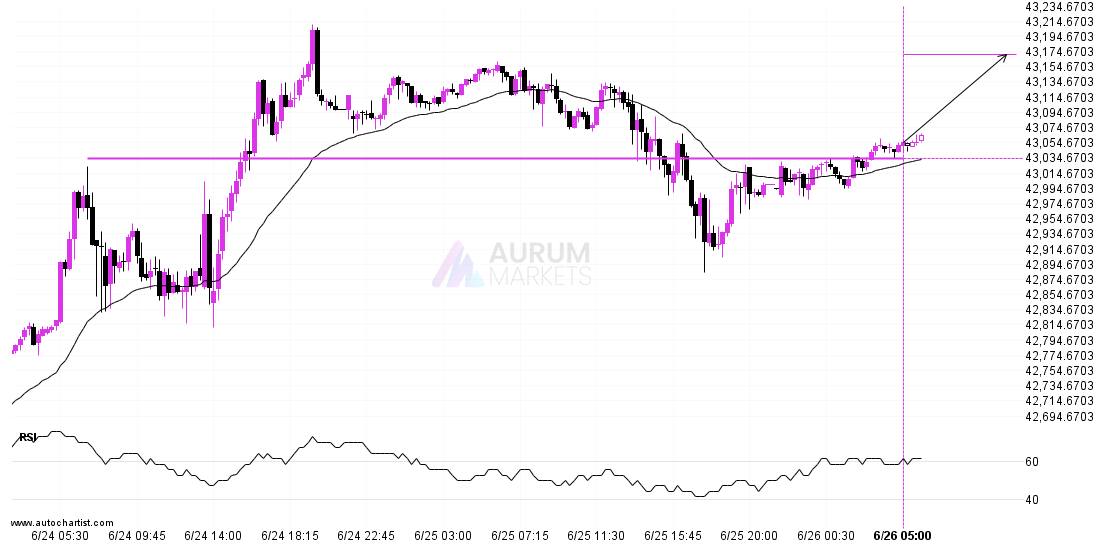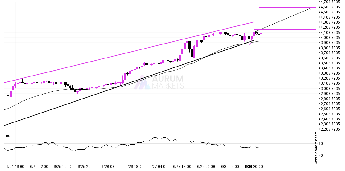 DOW 30 has broken through a resistance line. Because we have seen it retrace from this price in the past, one should wait for confirmation of the breakout before trading.