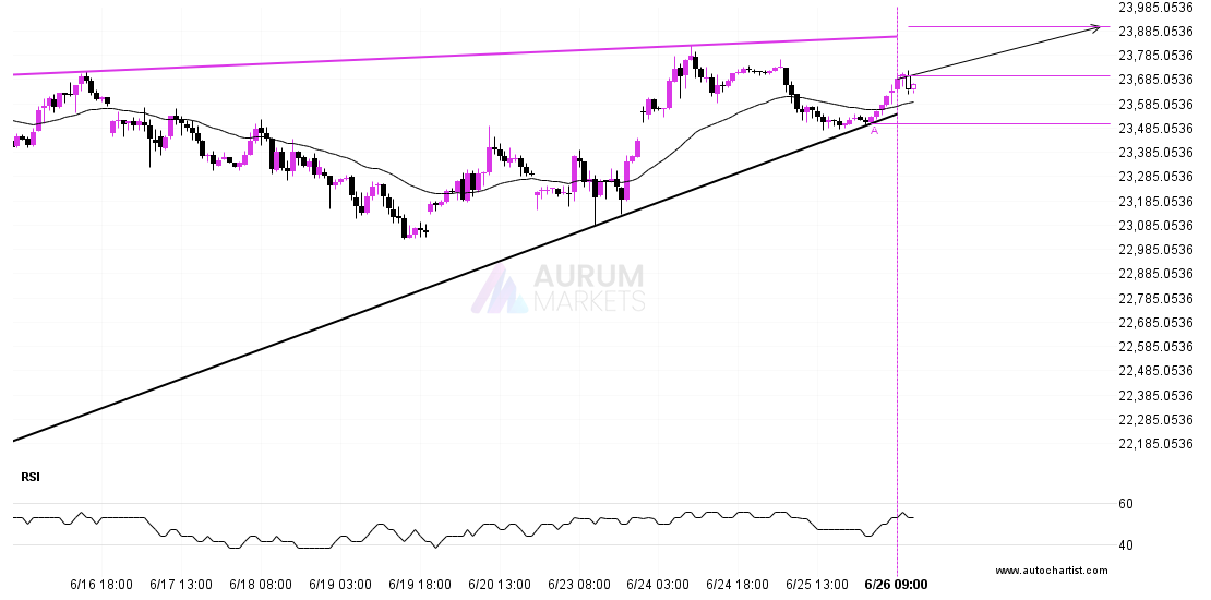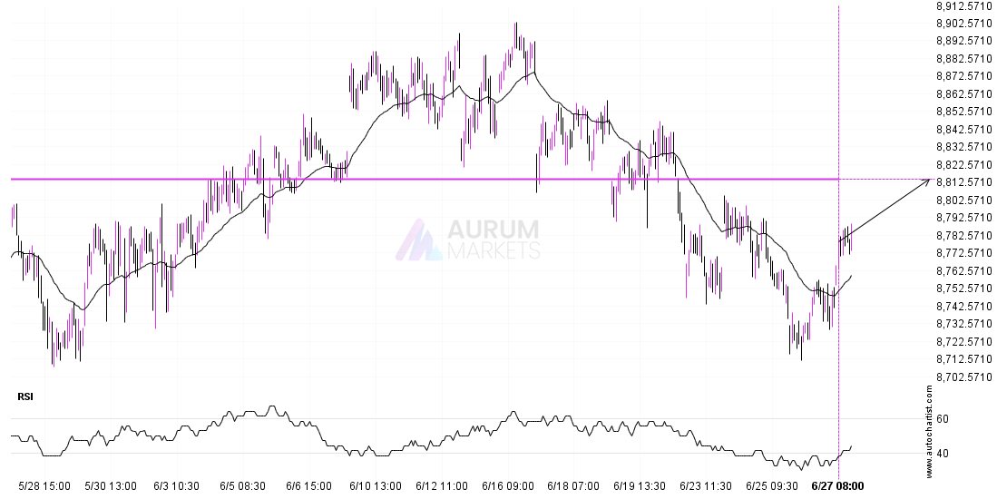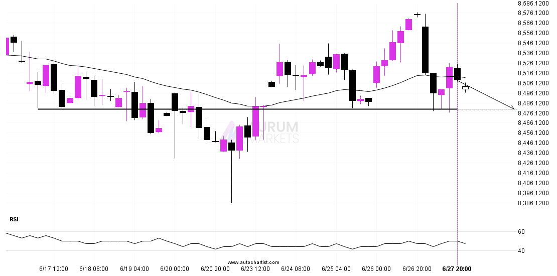 An emerging Channel Down has been detected on FTSE 100 on the 1 hour chart. There is a possible move towards 8659.6319 next few candles. Once reaching resistance it may