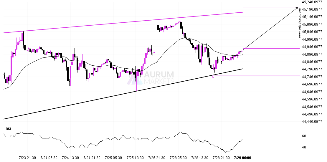 DOW 30 was identified at around 44934.44 having recently rebounded of the support on the 30 Minutes data interval. Ultimately, the price action of the stock has formed a Rising