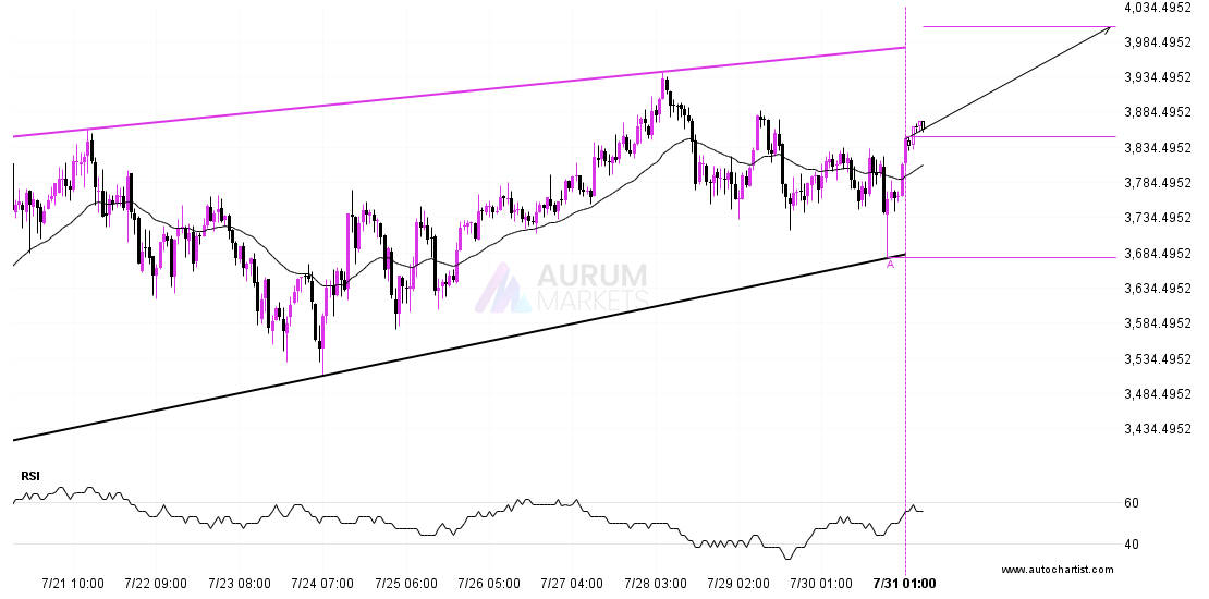 Emerging Rising Wedge pattern in its final wave was identified on the ETHUSD 1 hour chart. After a strong bullish run, we find ETHUSD heading towards the upper triangle line
