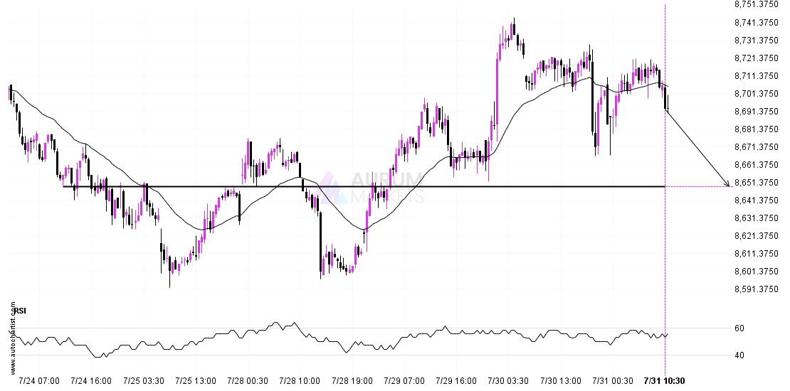 ASX 225 is moving towards a key support level at 8649.0000. ASX 225 has previously tested this level 4 times and on each occasion it has bounced back off this