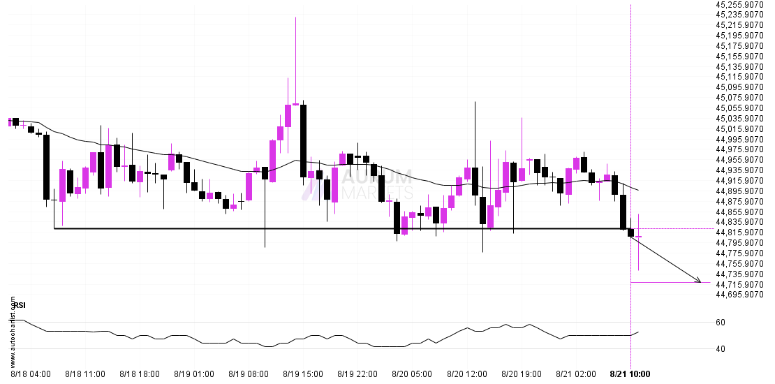 Approaching Support level of 8,877.0000 identified at 8/29 21:00. This pattern is still in the process of forming. Possible bearish price movement towards the support 8,877.0000 within the next 1 day.Approaching Support level of 8,877.0000 identified at 8/29 21:00. This pattern is still in the process of forming. Possible bearish price movement towards the support 8,877.0000 within the next 1 day.