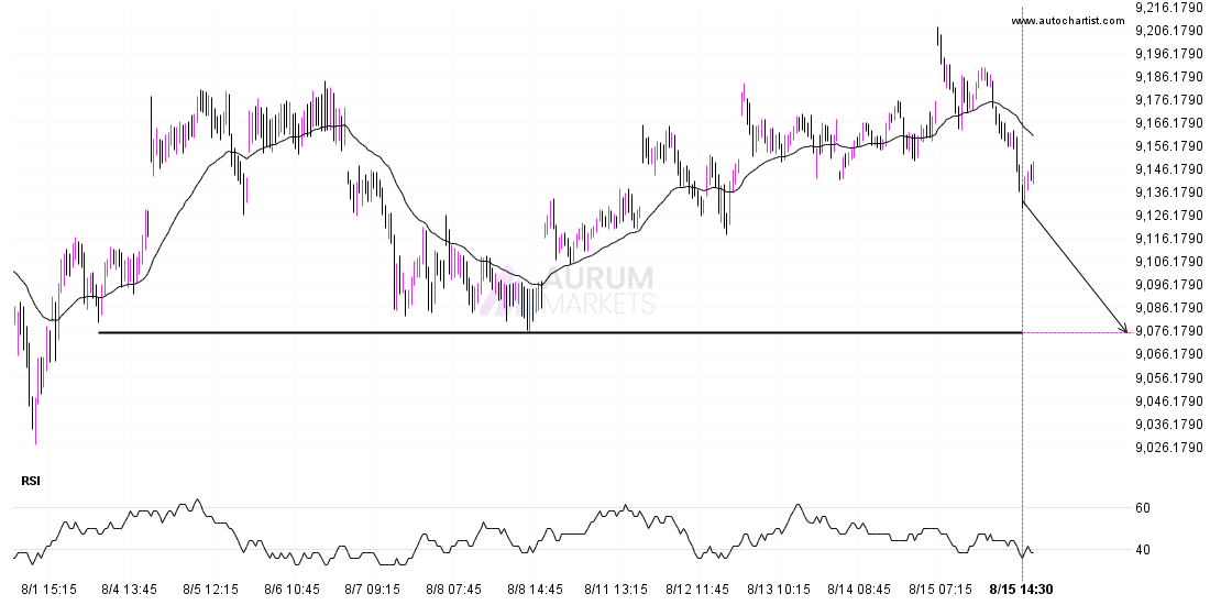 FTSE 100 is heading towards 9075.2998 and could reach this point within the next 18 hours. It has tested this line numerous times in the past, and this time could