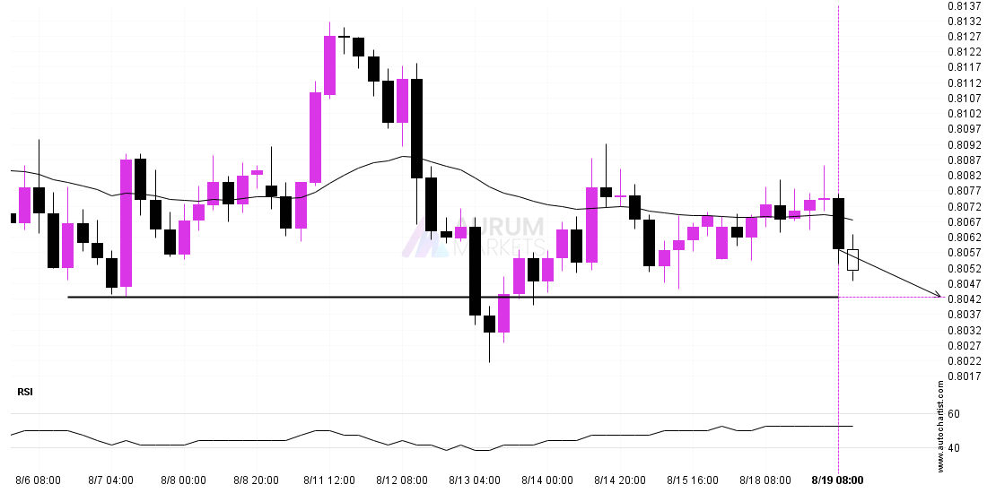 A strong support level has been identified at 0.8043 on the 4 hour USDCHF chart. USDCHF is likely to test it soon. Supported by Downward sloping Moving Average Target: 0.8043