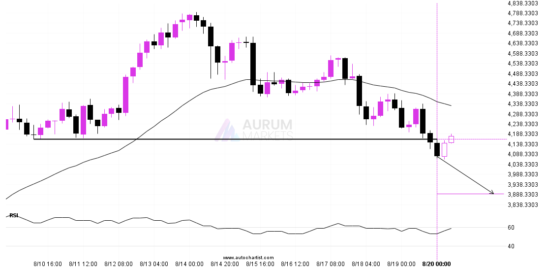 Rising Wedge pattern identified on FTSE 100 has broken through a support level with the price momentum continuing to move in an downward direction. A solid trading opportunity continues with