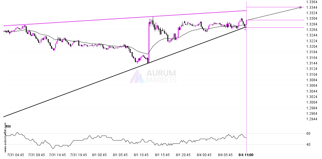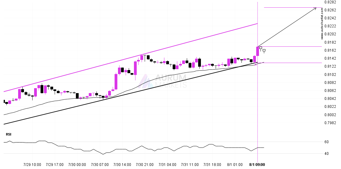Triangle pattern identified on NZDUSD has broken through a resistance level with the price momentum continuing to move in an upward direction. A solid trading opportunity continues with the price