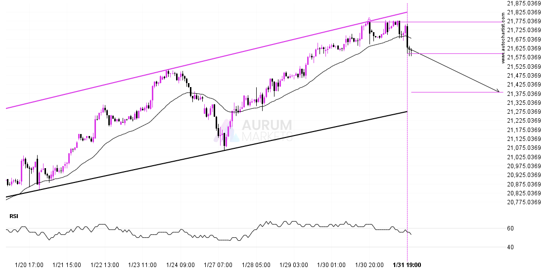 DAX 40 moved through the support line of a Rising Wedge at 21680.35789473684 on the 15 Minutes chart. This line has been tested a number of times in the past