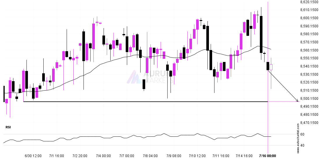 ASX 225 is approaching a support line at 8496.0000. If it hits the support line, it may break through this level to continue the bearish trend, or it may turn around back to current levels.