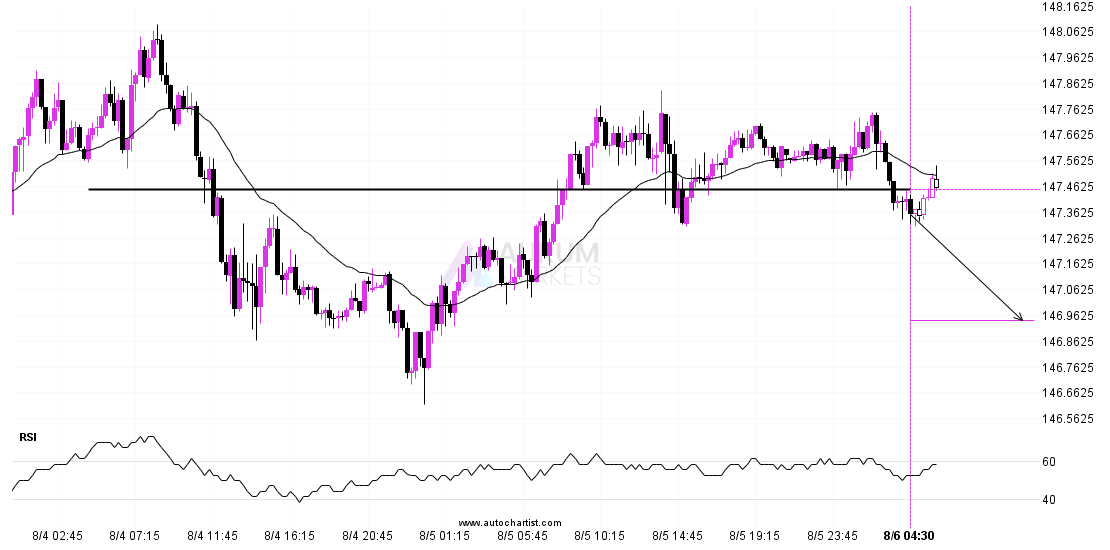 DAX 40 moved through the support line of a Rising Wedge at 21680.35789473684 on the 15 Minutes chart. This line has been tested a number of times in the past and this breakout could mean an upcoming change from the current trend. It may continue in its current direction toward 21496.4832.