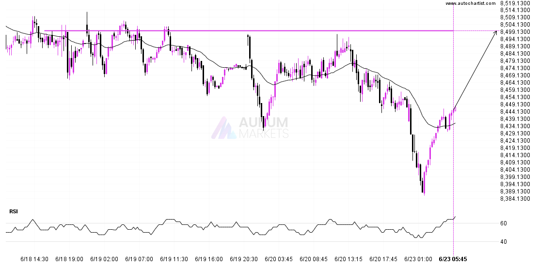 Emerging Channel Up detected on FTSE 100 – the pattern is an emerging one and has not yet broken through support, but the price is expected to move up over the next few hours. The price at the time the pattern was found was 8475.13 and it is expected to move to 8517.3127.