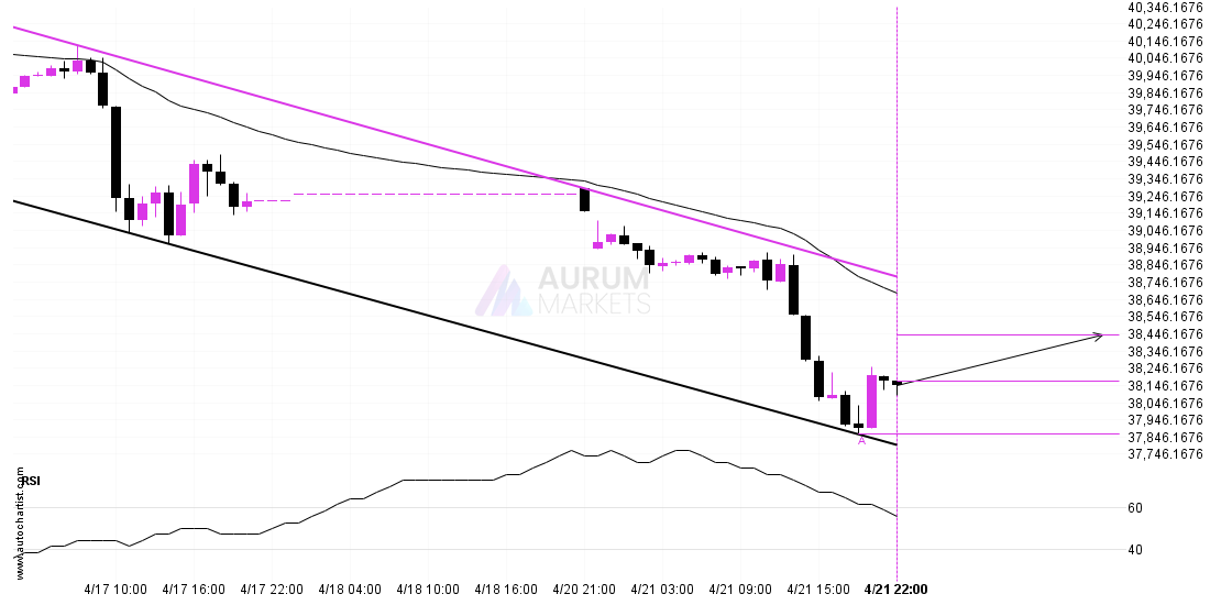 ASX 225 is moving towards a resistance line. Because we have seen it retrace from this level in the past, we could see either a break through this line, or a rebound back to current levels. It has touched this line numerous times in the last 5 days and may test it again within the next 12 hours.