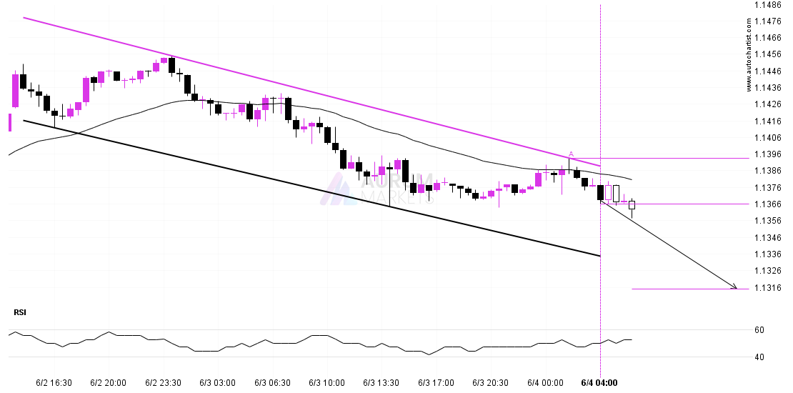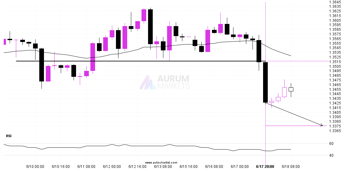 Broke through Support level of 1.1464 at 12/12 22:00. Possible bearish price movement forecast for the next 12 hours towards 1.1439.