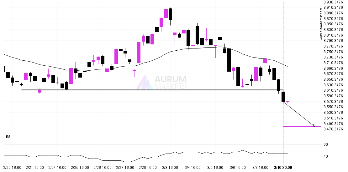 ASX 225 has broken through the resistance line of a Triangle technical chart pattern. Because we have seen it retrace from this line in the past, one should wait for confirmation of the breakout before taking any action. It has touched this line twice in the last 5 days and suggests a possible target level to be around 7776.3110 within the next 8 hours.