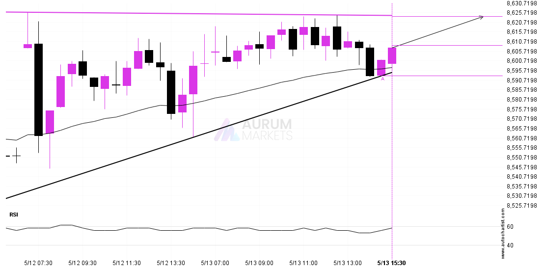 The breakout of FTSE 100 through the support line of a Triangle could be a sign of the road ahead. If this breakout persists, we may see the price of FTSE 100 testing 8580.9758 within the next 8 hours.