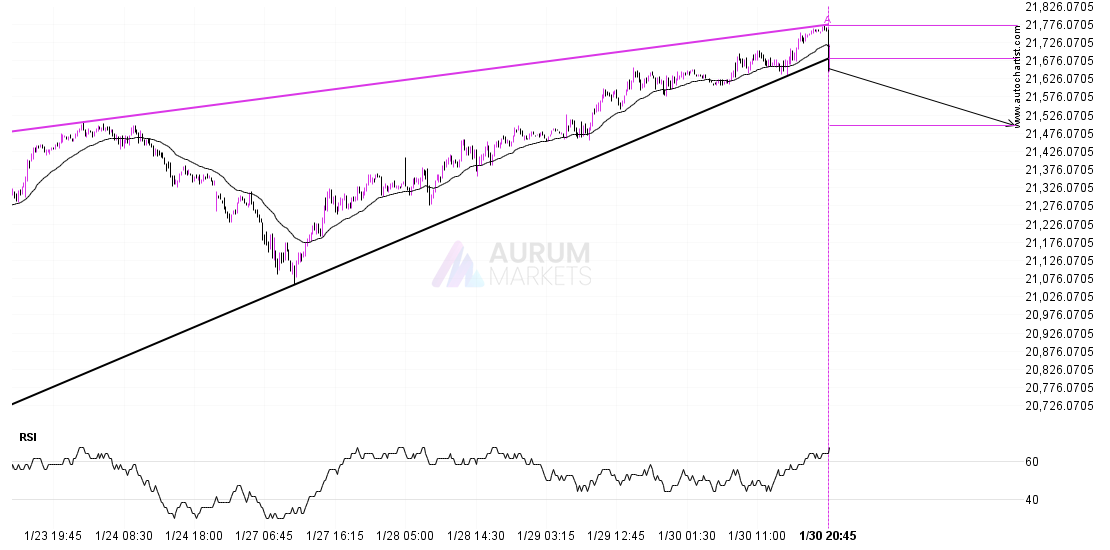 Approaching Support level of 6,740.40 identified at 12/18 21:15. This pattern is still in the process of forming. Possible bearish price movement towards the support 6,740.40 within the next 5 hours.