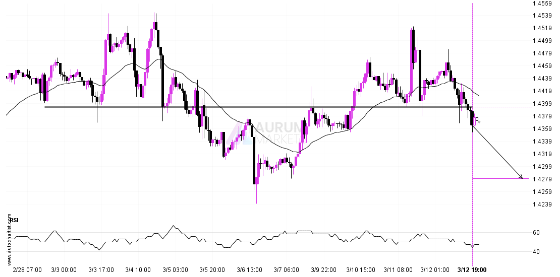 USDCAD has broken through a support line. It has touched this line numerous times in the last 13 days. This breakout shows a potential move to 1.4280 within the next 2 days. Because we have seen it retrace from this level in the past, one should wait for confirmation of the breakout.