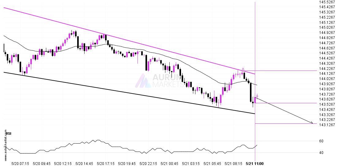 A Falling Wedge pattern was identified on USDJPY at 143.5505, creating an expectation that it may move to the support line at 143.1548. It may break through that line and continue the bearish trend or it may reverse from that line.