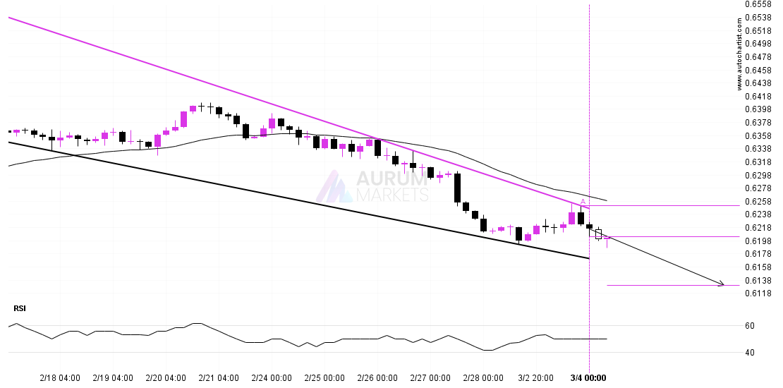 Emerging Channel Down detected on USDJPY – the pattern is an emerging one and has not yet broken through resistance, but the price is expected to move up over the next few hours. The price at the time the pattern was found was 149.193 and it is expected to move to 146.6860.